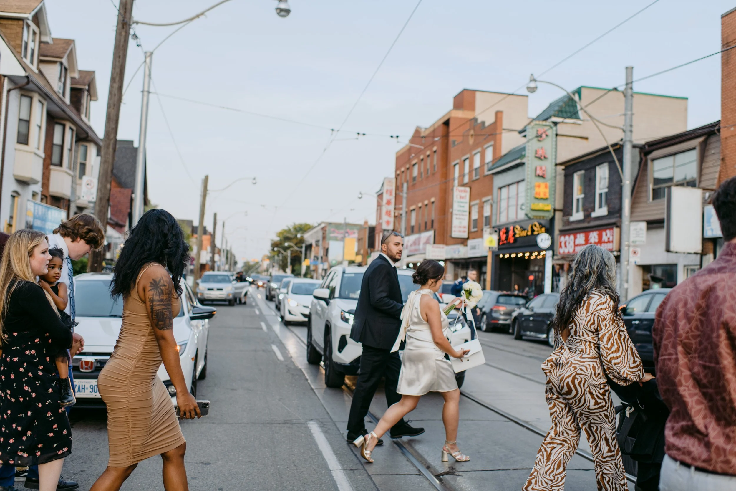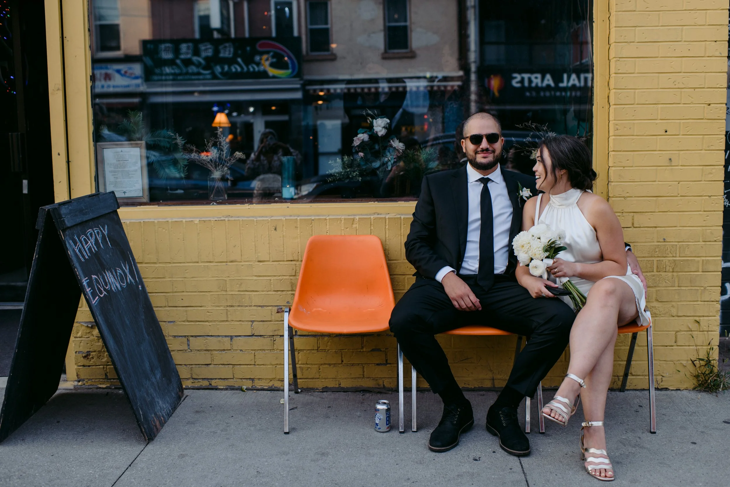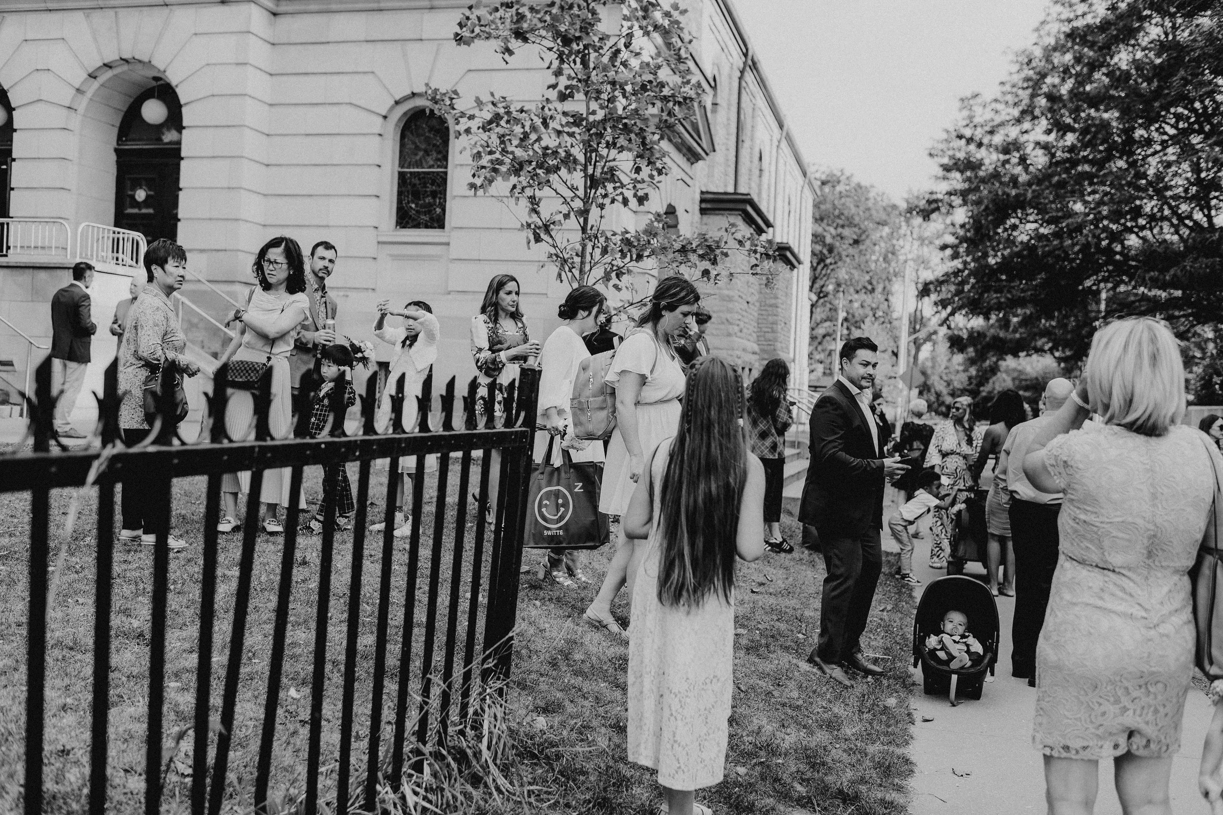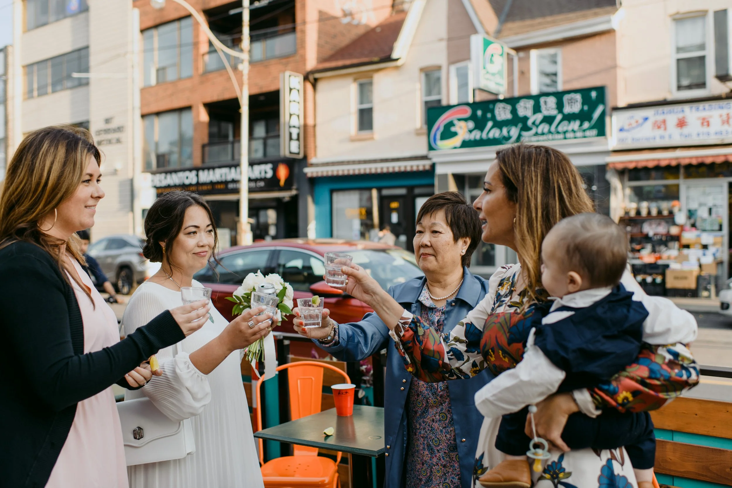 erica and geoff did a city hall wedding during the pandemic but realized they actually did want to celebrate too — nothing big or elaborate, just have an afternoon and evening with a small group of their family and friends. through a mutual friend they found me, and i am so glad i didn’t miss this. i’ve seen a lot over my past decade plus as a wedding photographer, but i am far from having seen it all, and this day was so out of the ordinary in the best way. they had a ceremony in the neighbourhood where they had lived for years in toronto, then we all walked over to a nearby park and patio until the karaoke bar (dine and dim) opened on gerrard st east. as a documentary photographer, i feel like i thrive in this kind of expansiveness of time and space, and it was clear from everyone’s faces that there was nowhere else anyone would’ve rather been. truly lovely to have documented this day.